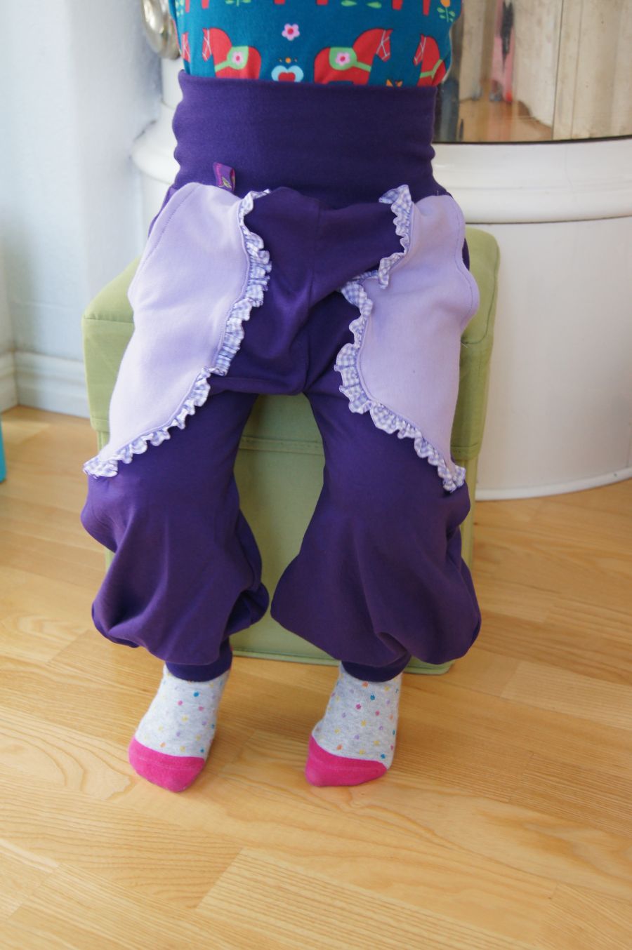 Ich habe dunkellila Jersey von den Sujikers (Wink an Muddi) mit hellila Jersey aus dem Stoffladen in Oskarshamn kombiniert. Die Vichi-Rüschenborte, die ich noch rumliegen hatte, kam mir gerade recht.!Irgendetwas fehlte an den Taschen. Finde die Rüschen total niedlich! So kann man die Hose sogar zu festlichen Anlässen anziehen, aber sie verliert trotzdem nicht ihre Alltagstauglichkeit. Hat jemand eine Ahnung, ob die Rüsche in den Trockner darf? Sonst muss ich die Hose ja immer so trocknen lassen:(